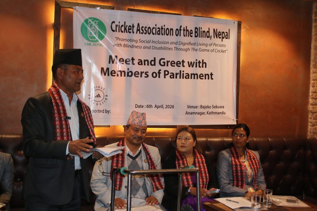 नेत्रहीन क्रिकेट संघ नेपाल ले अपाङ्गता खेलकुदको विकास र प्रवर्द्धनका लागि प्रतिनिधि सभा सदस्यहरूसँग परिचयात्मक तथा अन्तरक्रियात्मक (Meet & Greet) कार्यक्रम सम्पन्न गरेको छ। कार्यक्रममा अपाङ्गता भएका व्यक्तिहरूको अधिकार, समावेशी खेलकुद विकास तथा नेत्रहीन क्रिकेटको वर्तमान अवस्था र भविष्यका सम्भावनाबारे विस्तृत छलफल गरिएको थियो।
